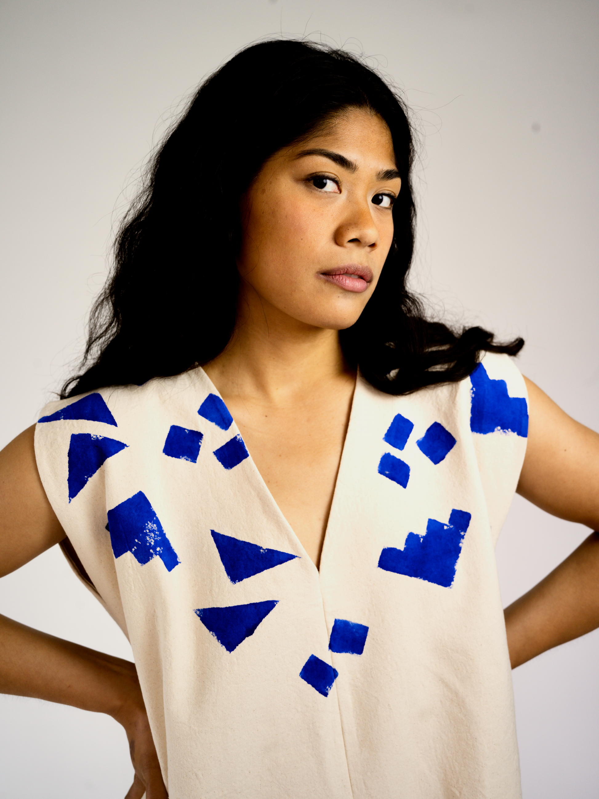 our GEO print in bleu is hand block-printed with natural pigments combined with a plant based resin, safe for skin and for the earth.