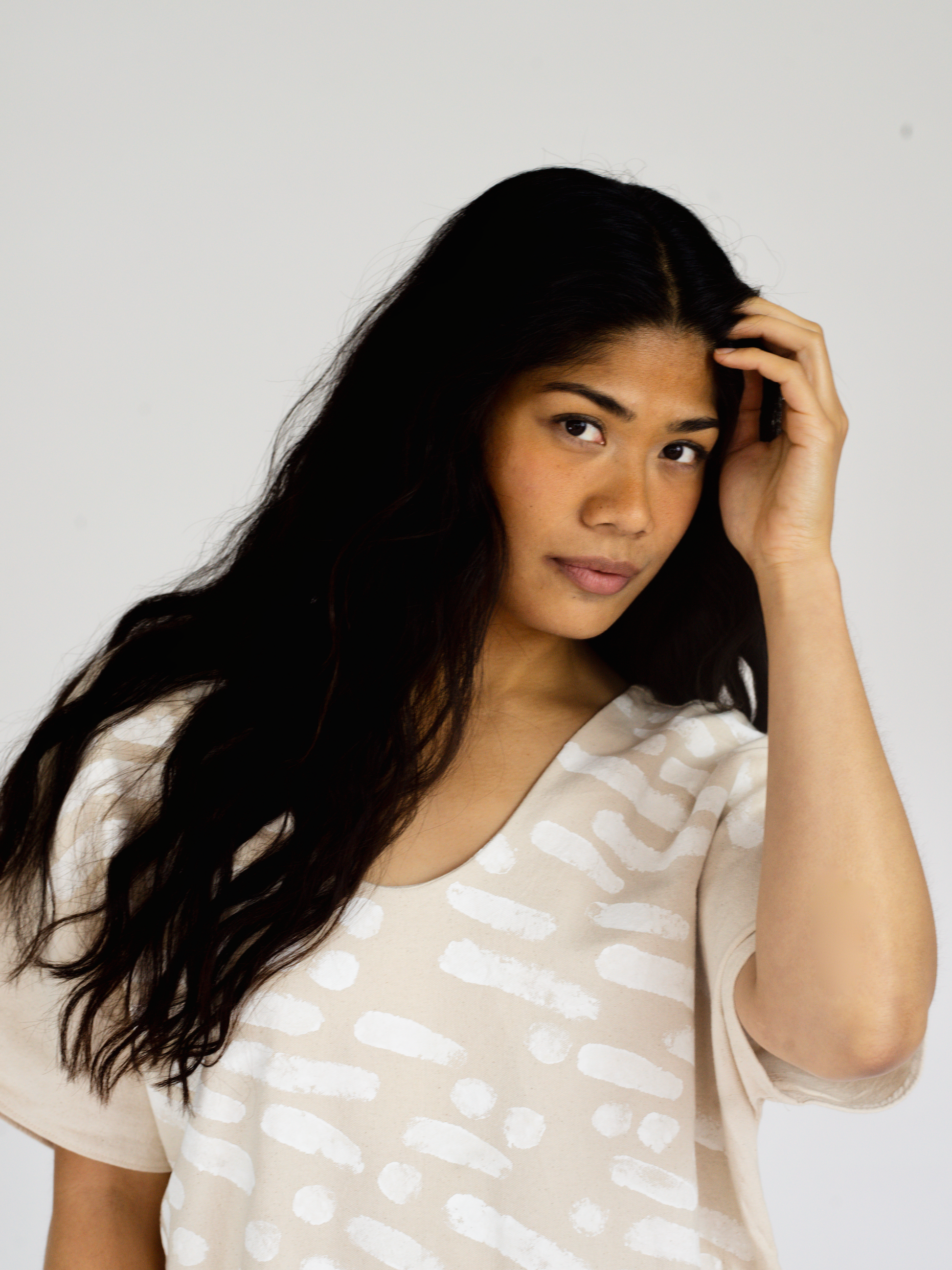 our LIGNE print in blanc is hand block-printed with natural pigments combined with a plant based resin, safe for skin and for the earth.